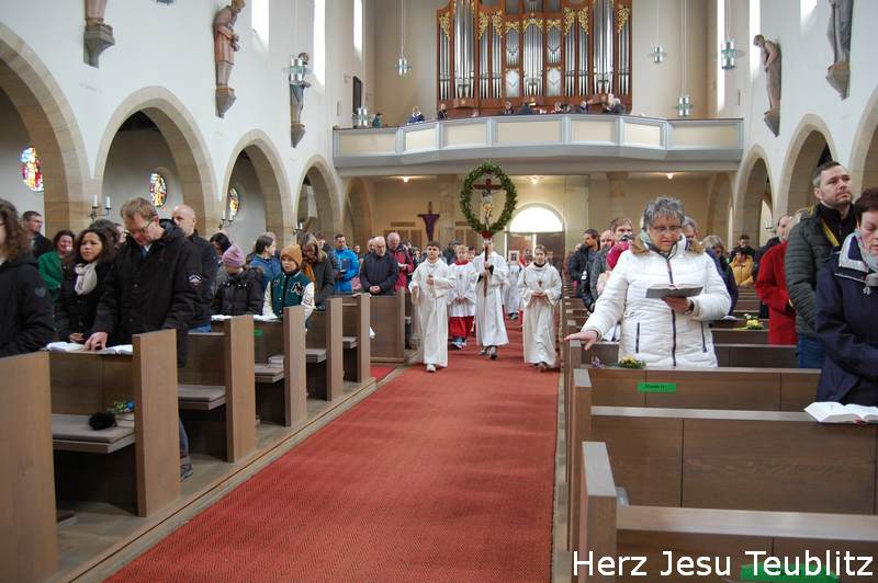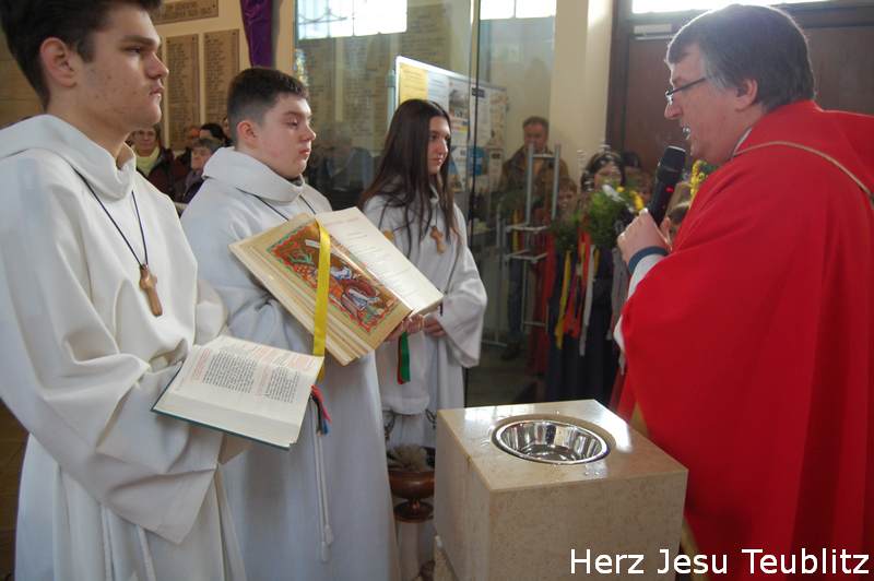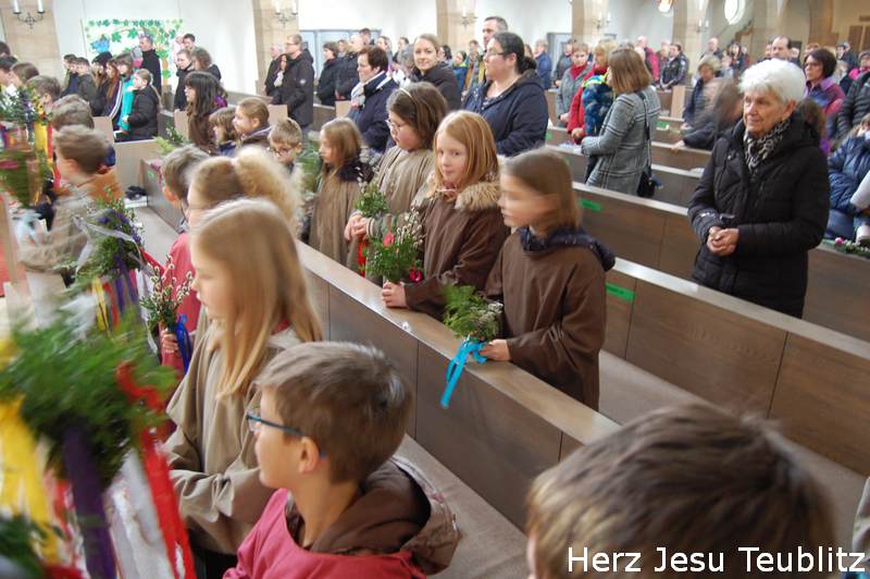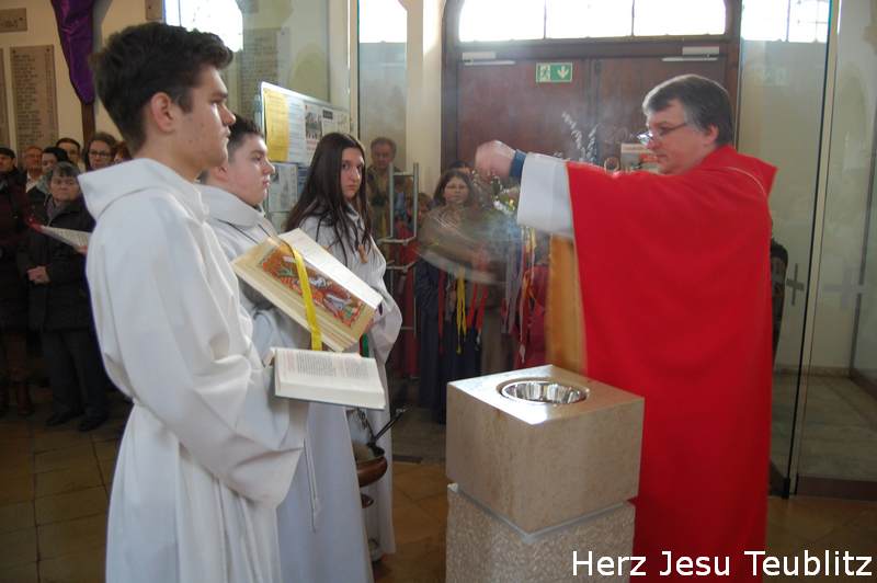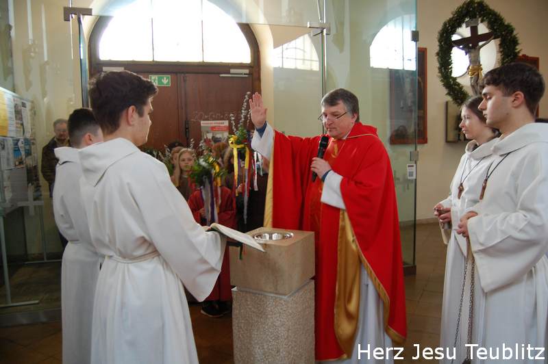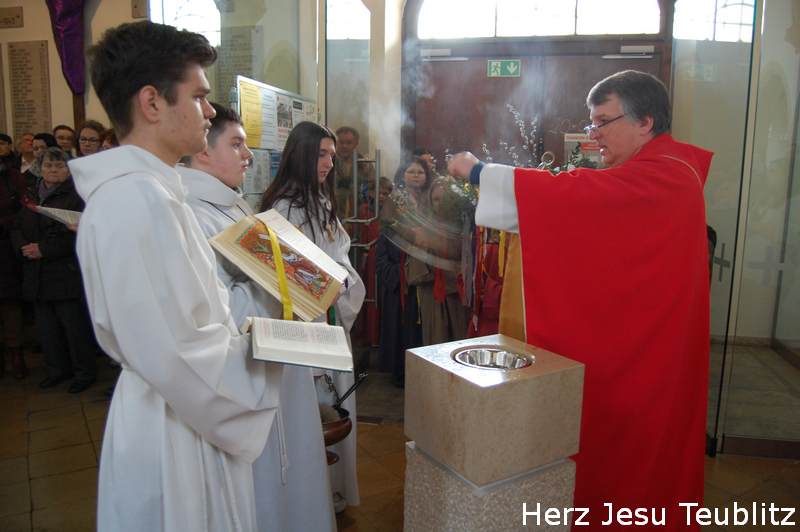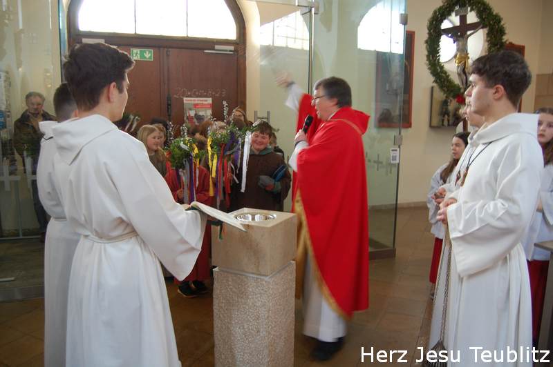Mit dem Palmsonntag betinnt die Heilige Woche, die Karwoche, in der Christen weltweit dem Leiden, Sterben und dem Auferstehen Jesu Christi gedenken. Die Litrugie des Palmsonntag beginnt mir der Segnung der Palmzweige und erinnert an den Einzug Jesu in Jerusalem. Aufgrund des Regens musste die Palmprozession vom Stadtplatz zur Kirche dieses Jahr ausfallen. Deshalb fand die Segnung der Palmbuschen und die Verkündigung des Palmsonntagsevangelium im hinteren Bereich der Kirche statt.