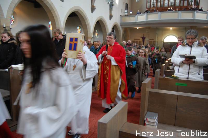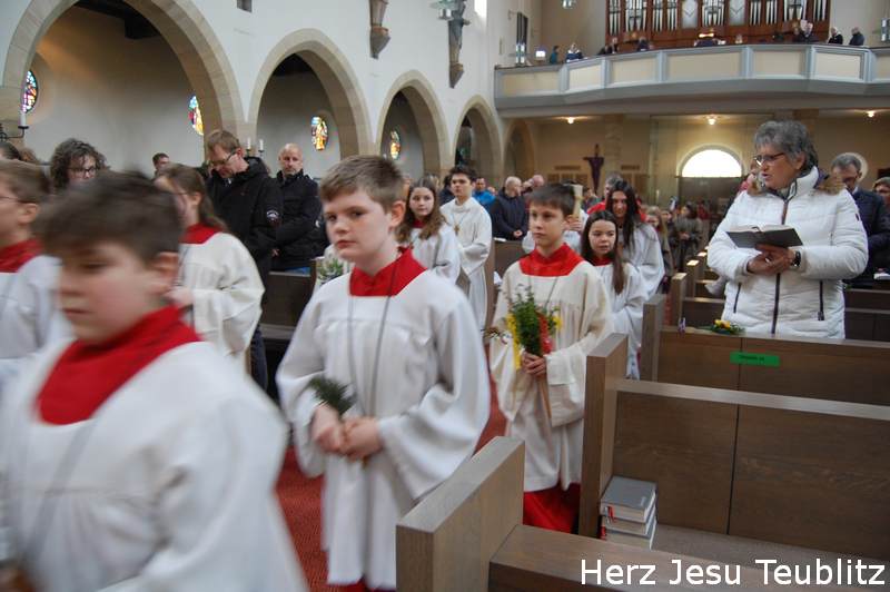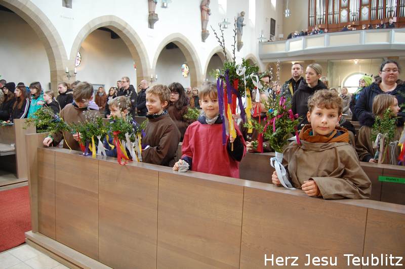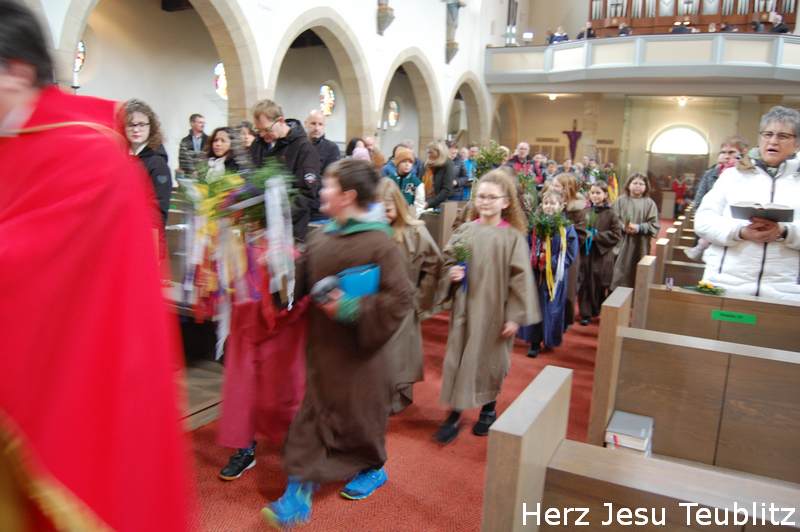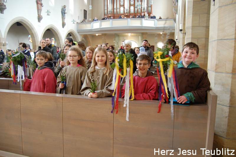 Den Gottesdienst beleiteten auch die Kommunionkinder und Firmbewerber mit. Sie bastelten dafür eigens Palmbuschen. Verkleidet als Jüngerinnen und Jünger begleiteten die Kommunonkinder die Prozession durch die Kirche. Zum Wortgottesdienst wurde die Leidensgeschichte Jesu in verschiednene Rollen vorgetragen.