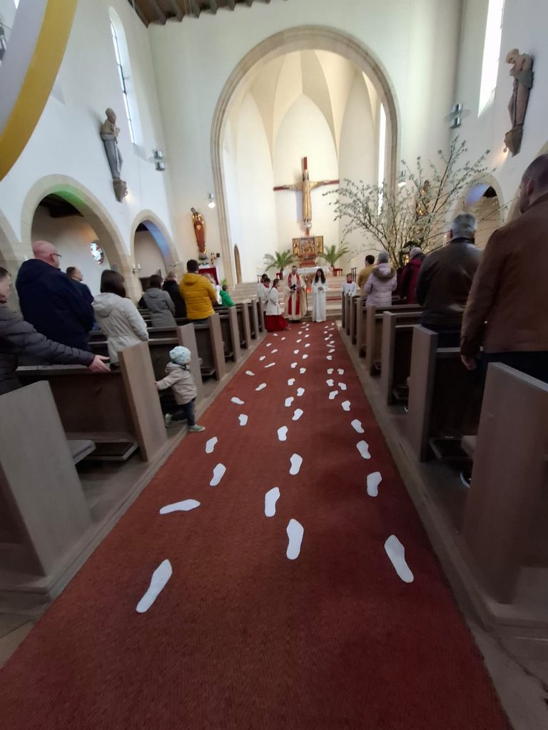 Ein besonderes Bild begleitete den Gottesdienst: Fußspuren. Dunkle Fußspuren für die schweren Wege des Lebens – wenn wir traurig sind, Angst haben, uns allein fühlen. Wege, die sich manchmal hoffnungslos anfühlen.