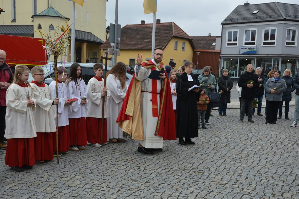Der Rathausplatz in Teublitz war in diesem Jahr der Ausgangspunkt einer Feier, die von Anfang an ein starkes Zeichen setzte: Seite an Seite standen Pfarrer Lobmeier und Pfarrerin Hanna Fiedler-Stahl von der evangelischen Gemeinde Maxhütte-Haidhof, um gemeinsam mit den Gläubigen beider Konfessionen in die Heilige Woche einzuziehen. Was uns verbindet, ist größer als das, was uns trennt – und der Palmsonntag hat das auf berührende Weise sichtbar gemacht.